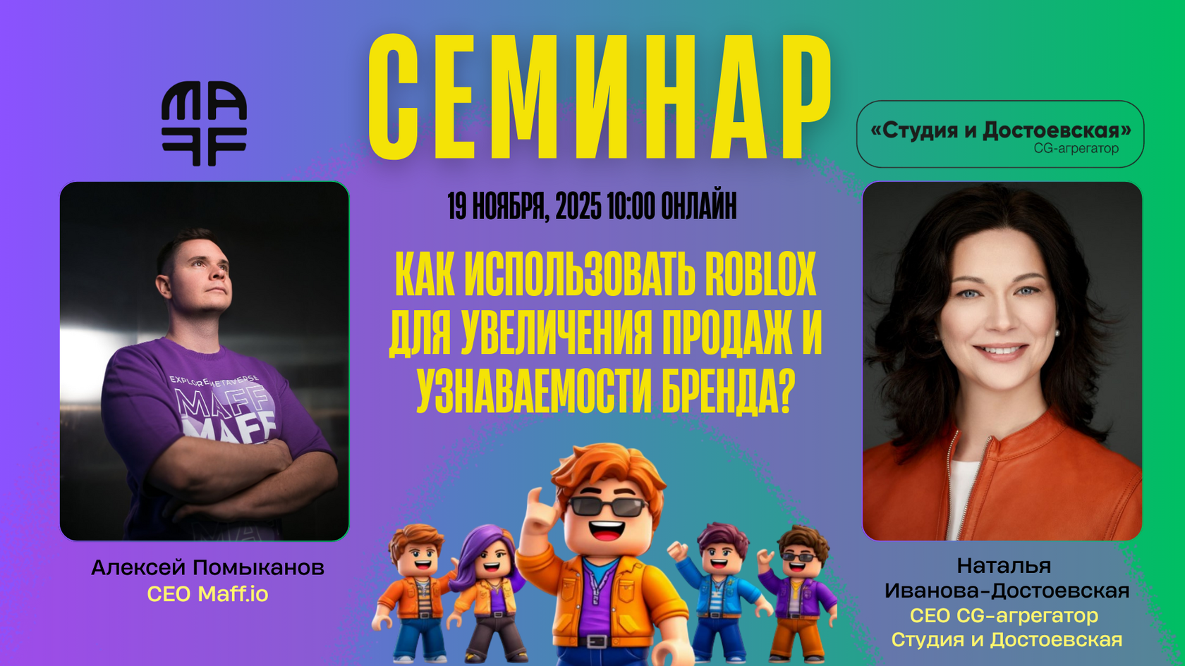 19 ноября состоялся профессиональный семинар РоблоМарафон, посвящённый маркетинговому продвижению брендов в метавселенной Roblox. Мероприятие провели Наталья Иванова-Достоевская, CEO CG-агрегатора «Студия и Достоевская», и Алексей Помыканов, CEO студии Maff.